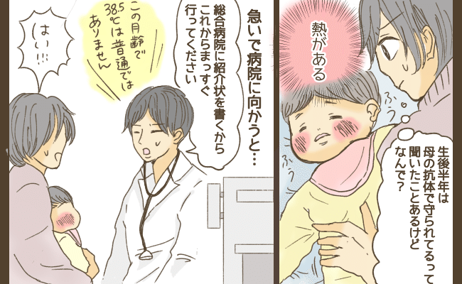 なんだろう……これは?と考えながら、あれ? そういえば娘、熱いかもしれない!と気づき、慌てて体温計で測ると38.5度。赤ちゃんは生後半年くらいまでお母さんからの移行抗体で守られていると聞いたことがあるけど、なぜ??