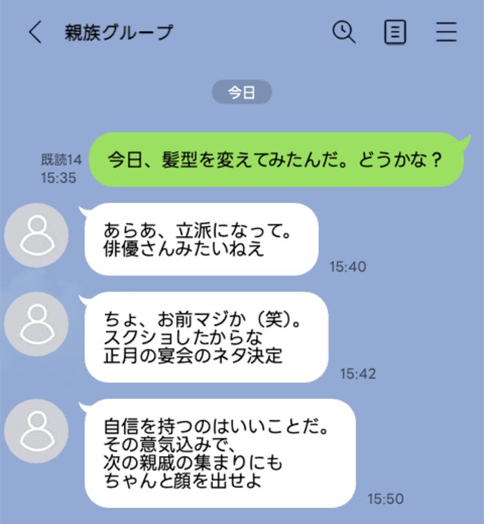 送信先は、お目当ての彼女のトーク画面ではなく、親戚15名が集まる「親族グループ」だったのです。