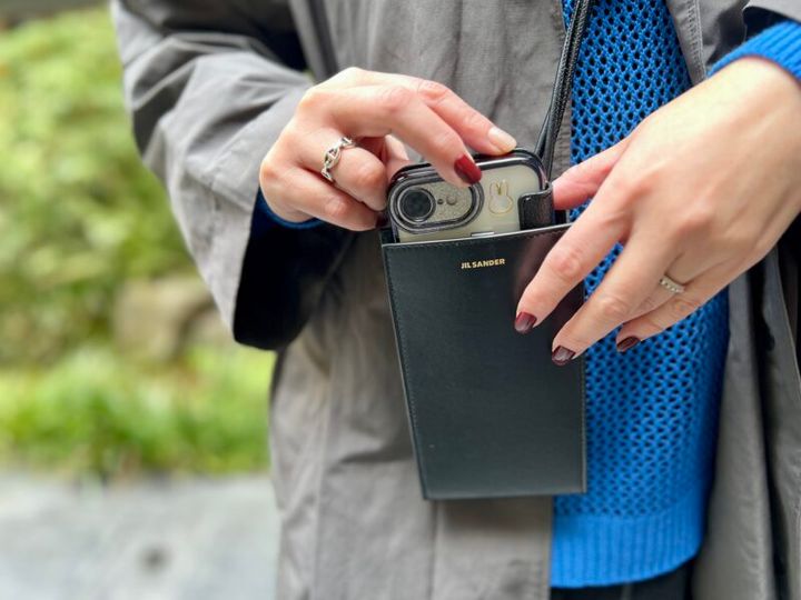 黒のスマホショルダーは「ジルサンダー」。「ジャストサイズなフィット感が気に入って使っています」。これなら、オフィシャルなシーンでも気兼ねなく斜めがけできそう。
