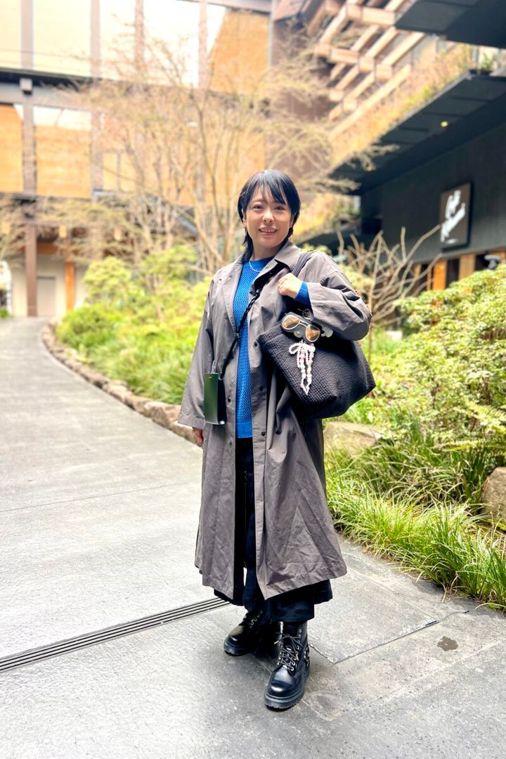 アパレルでの勤務経験も長かったという川久保さんは、甘辛ミックススタイルが得意技。「ずっと好きなのは、ギャルソン、ラルフローレンですが、どこであれ、その時気に入ったものが好きです」。この日は、インに着たジップアップワンピースの裾をあえてスリットのように開けて、「ドクターマーチン」のメンズライクな印象を際立たせた着こなし。「体型の変化が気になるので、Iラインになるスタイリングを心がけています」。