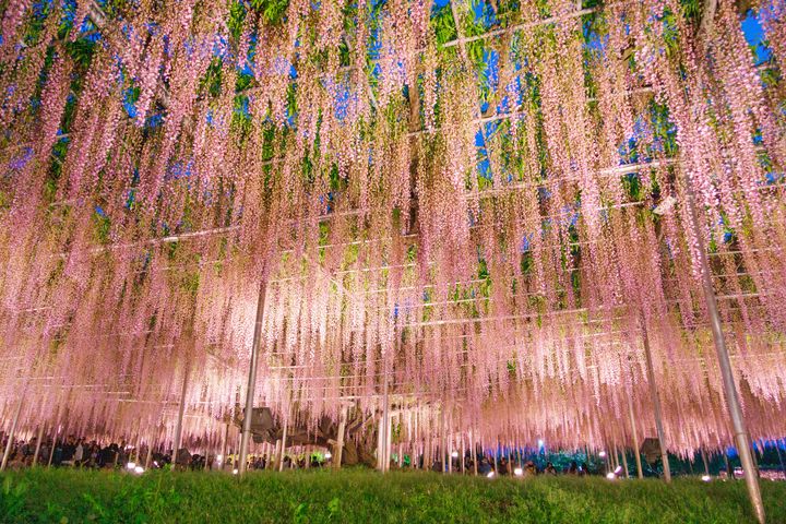 世界からも注目を集めるこのパークでは、春になると350本以上の藤が咲き誇り、まるでシャンデリアのような大藤棚が現れます