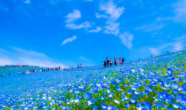 茨城県ひたちなか市にあるこの公園では、4月中旬になると約530万本ものネモフィラが丘を青く染め上げます