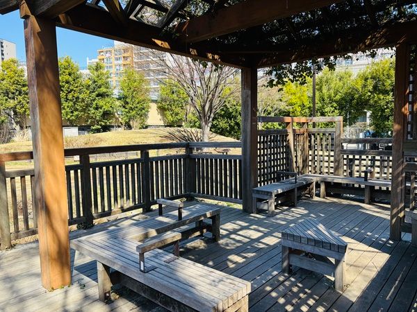 杉並区立中央図書館は、2020年にリニューアルオープンし、子連れに優しく、学生たちにも嬉しい工夫が満載の図書館へと生まれ変わりました。その図書館に隣接するこちらの公園は、図書館で借りた本を読む方がいたり、子連れで遊びに来ている方がいたり、と地域の憩いの場となっています。