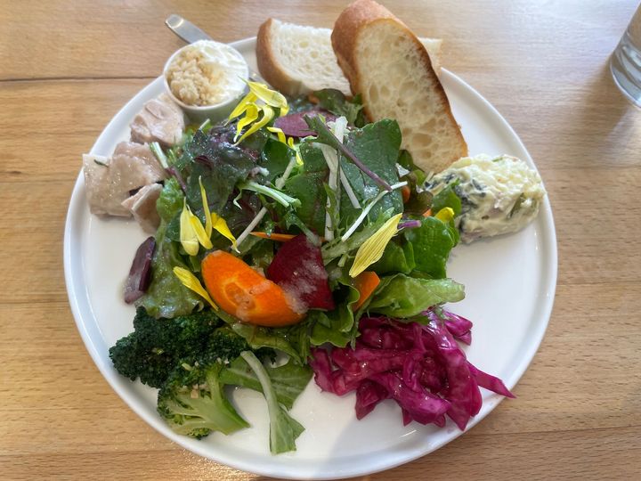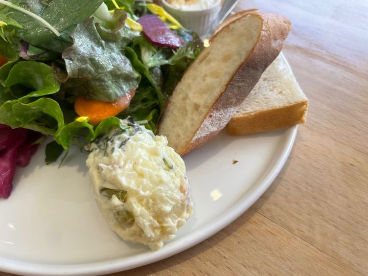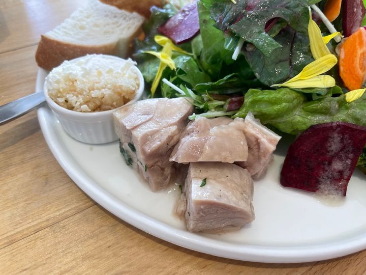 お肉は鶏肉。 サラダプレートというと野菜ばかりのものもありますが、こちらはお肉もついているので満たされます。 また、左側はオリジナルのバター。パンに付けていただくのですが、これも独特な味わいがとても美味しく、そのまま食べてしまいたいほど。