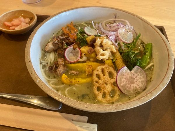 グリーンカレーのスパイスと揚げたお野菜、そして米粉の麺。