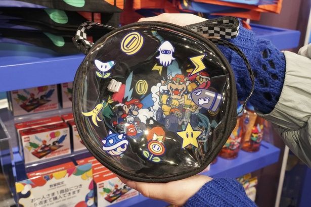 ポシェットは、マリオカートのアイテムが散りばめられた面がクリア素材でかわいい!反対側はタイヤ柄でクール。