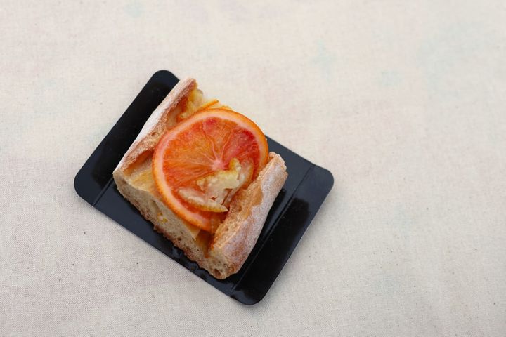 こちらも限定パンの一つで、バゲットにブラッドオレンジが乗ったおしゃれな一品です。「パンのフェスアワード2023」でグランプリを受賞したパンでもあり、そのおいしさはお墨付き。オレンジの甘酸っぱさがもちもちのバゲットと組み合わさって、上品な味わいが楽しめました。