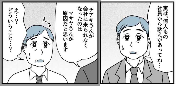 私はチアキ(35)。私が2人目の育休から戻ると、温かかった職場の雰囲気がガラリと変わっていました。その原因は社長の実の弟であるマサヤさん。口調が荒いし、不機嫌になるとすぐ大声を出して怒鳴るのです。私は必死で気を配り、怒らせないよう頑張っていました。1年経ち、精神的に限界を迎えた私がついに抗議すると「イヤなら辞めれば?」と返されました。私はその一言を聞いた瞬間、心のなかで糸がプツリと切れたように気力を失ってしまったのでした。