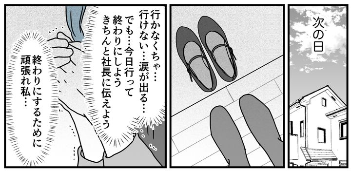 玄関先で靴を履こうとしても、しばらく動けません。自然と涙が流れてきます。なんとか自分を奮い立たせて出社するとすぐに会議室に呼ばれました。社長とマサヤさんが並んで座っています。向かい合うように私も席につきました。