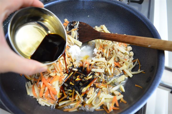 1. 鶏ひき肉と糸こんにゃくは食べやすい大きさに切り、しいたけ、にんじん、茹でたけのこは4~5cmの千切りにする。