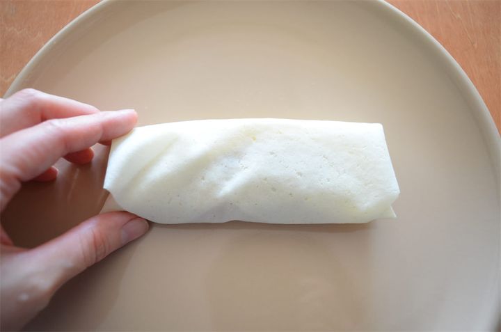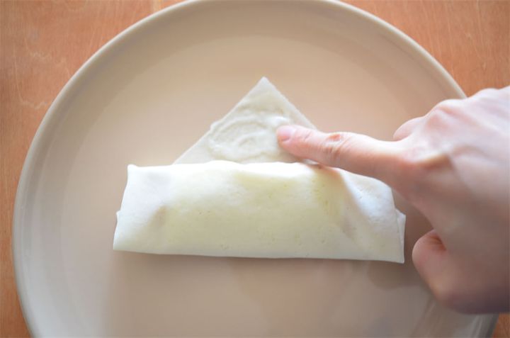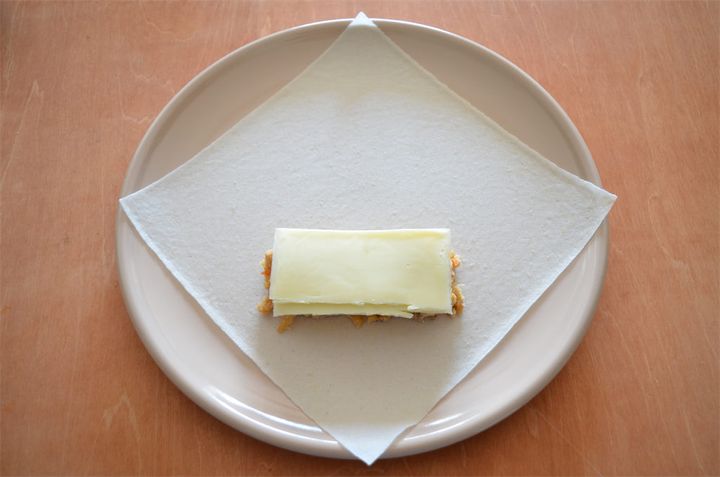 4. 春巻きの皮はツルツルの面を下にして置き、3、チーズの順にのせて空気を抜きながら包み、巻き終わりをよく混ぜた[水溶き小麦粉]で隙間ができないようにくっつける。