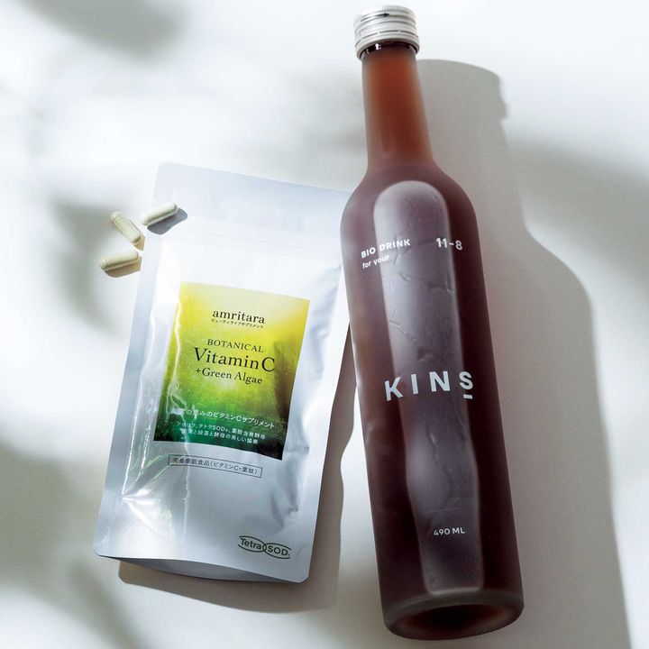 スキンケアを見直しても不調が続くなら、サプリにも注目。ビタミンCや乳酸菌を摂って、肌を土台から立て直すことから始めましょう。左:【ビタミンC】ポリフェノールやアントシアニンなども含むアセロラからビタミンCを摂取。ボタニカル ビタミンC+グリーンアルジー 90粒 ¥3,996()右:【乳酸菌】乳酸菌ほか効率的に菌ケアが叶う多彩な栄養素が凝縮。BIO DRINK 490ml ¥6,480()