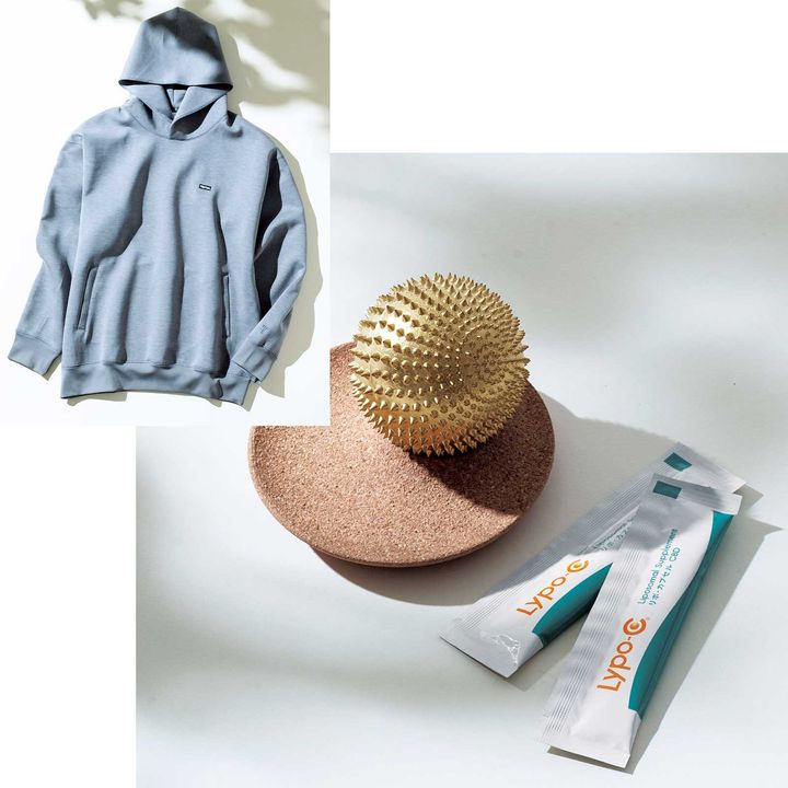 くすみの原因の一つに血行不良が考えられます。肌がゆらぐ時は、温めより、眠りの環境を整えることも意識して。左上:日中用リカバリーウェア。テックスウェット プルフーディー GRAY ¥16,940()中:スパイクの刺激で血行促進。シャクティ ワンダーボール ¥16,500(shakti)右:夜の休息を見直したい時に。Lypo-C CBD 27包入 ¥8,964()