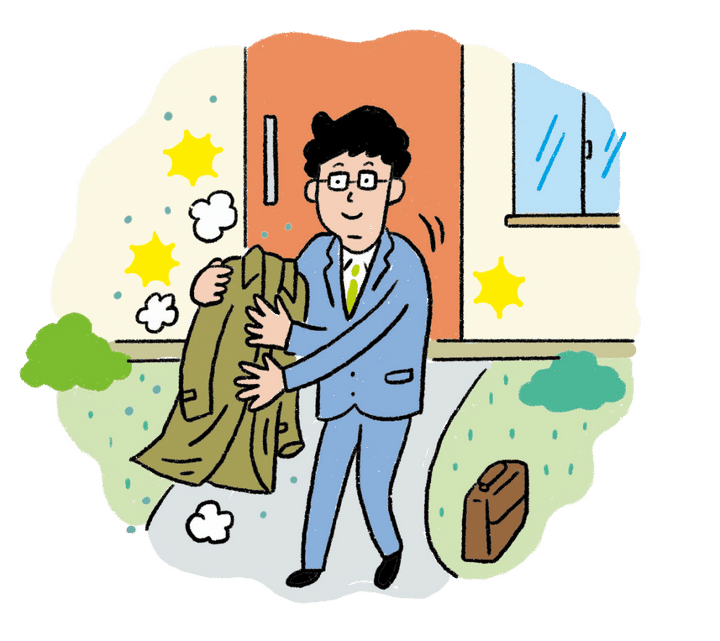 肩や腕だけでなく、静電気が発生しやすいバッグがこすれる部分、コートやスラックスのすそ、ふくらはぎの部分も花粉をしっかり払い、髪や帽子、マフラーなども忘れずに。花粉を払ったあとの手はすぐに洗うようにしましょう。衣類用のブラシや、衣類用粘着ローラーを使うと手では払いきれなかった花粉を取り除くことができるので、玄関に置いておくと便利です。