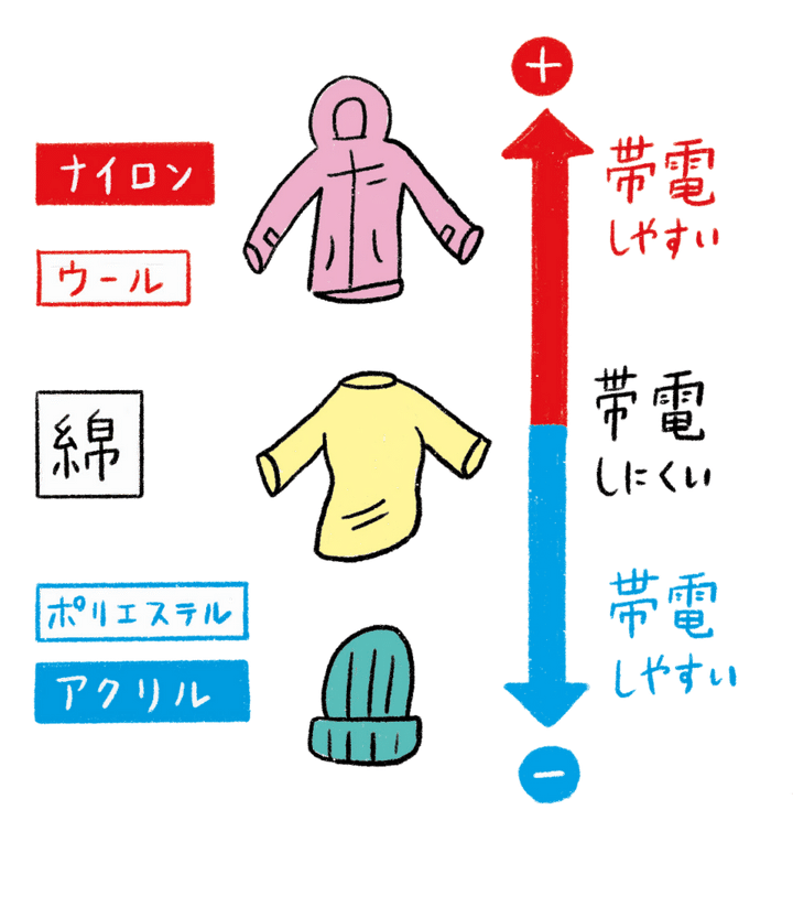 静電気は「衣類の組み合わせ」によって発生のしやすさが変わります。静電気が特に発生しやすいのは、ナイロンやアクリルなど「プラスに帯電しやすい素材」+「マイナスに帯電しやすい素材」の組み合わせ。同極の組み合わせや、帯電しにくい綿を間にはさめば、静電気は起きにくくなります。衣類の組み合わせをそのつど考えるのがめんどうなら、静電気防止スプレーを使うのも一案。