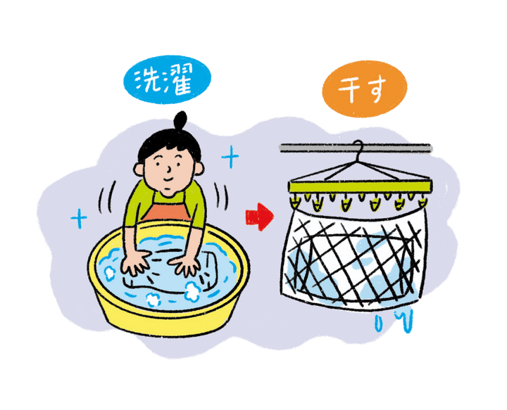 汗や皮脂、フケなどをエサとするダニ対策、におい対策としても、枕は天日干しだけでなく定期的な洗濯がおすすめです。洗濯表示を確認し、素材に合った方法で洗いましょう。ポリエステルやわた、羽毛の場合は、手洗い後、洗濯ネットに入れてネットごと洗濯ハンガーにつるすと干しやすく、より速く乾きます。