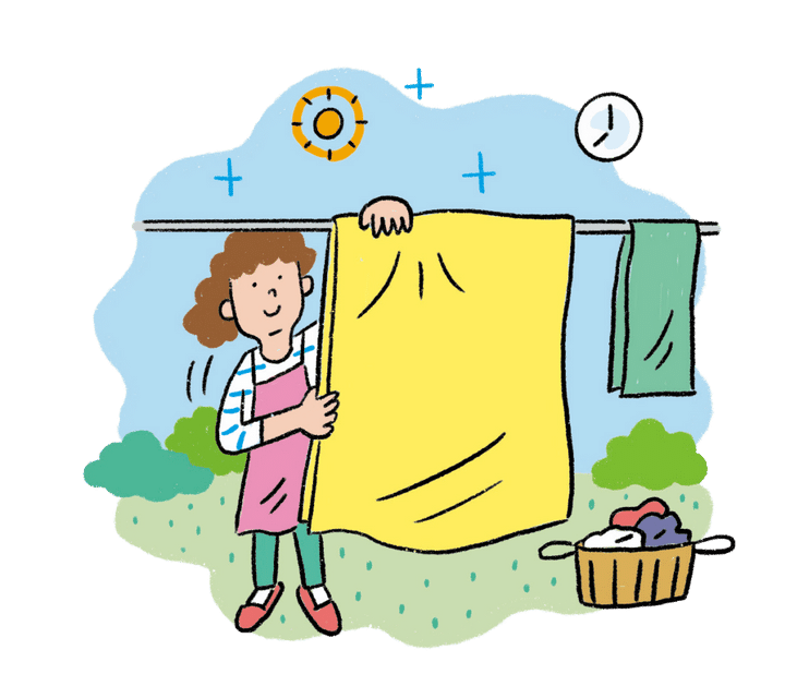 花粉シーズンは部屋干しが基本。とはいえ、シーツなどの大物は外に干したいですよね。ただ、ぬれた状態の布類には花粉が付着しやすいので、外に干すなら花粉の飛散量の多い時間帯を避け、早朝に干すのが基本です。飛散のピークを迎えるころには、ある程度乾いているように逆算し、乾いたらすぐに、花粉をよく払ってから取り込むようにしましょう。