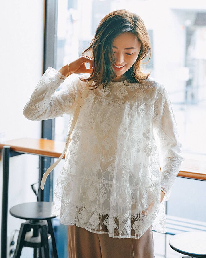 ⑥この春トレンドの「レースブラウス」を大人っぽく纏う