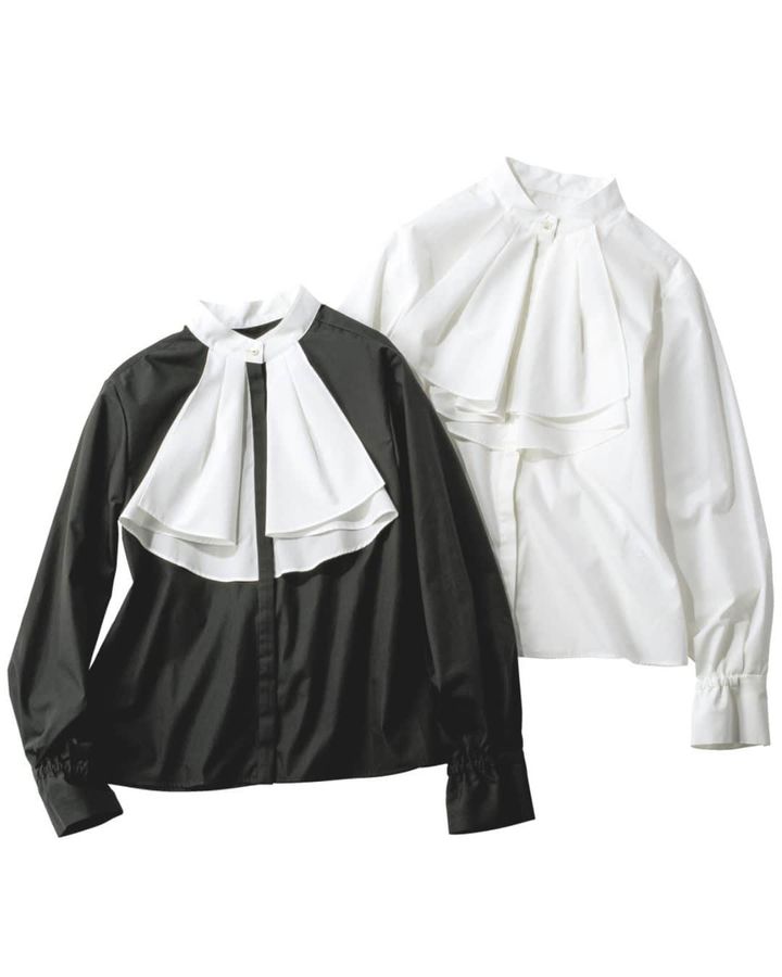 胸元を飾るドラマティックなフリルは、かつてヨーロッパの貴族や格式の象徴とされた〝ジャボ〟から着想。ドレープが美しく、クラシカルだけどモードな印象に。
