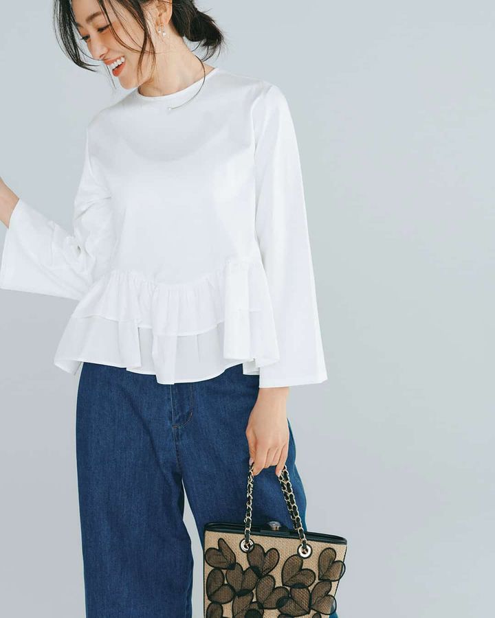 ➀きちんと感とカジュアル感を両立「裾フリルトップス」