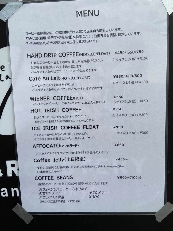 気になるメニューですが、ハンドドリップコーヒー、ウィンナーコーヒー、アイリッシュコーヒー、アフォガード、土日限定でコーヒーゼリーなどをいただくことができます。ハンドリップコーヒーなどは、ホットやアイスだけでなく、フロートにもしてくれます。100gからコーヒー豆も購入できますよ。メニュー表にどんなドリンクやスイーツなのかもわかりやすく、丁寧に書かれているので、是非訪問した際はメニュー表もじっくり目を通してみて下さいね。