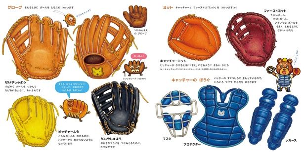 いろいろな道具があるのも野球ならでは。色彩豊かに描かれたピカピカの道具に、子どもたちの野球への憧れがますます募りそうです。
