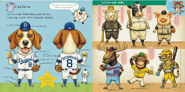 さらに、ユニフォームの歴史を見ると、100年以上前から現在に至るまで、時代にあわせてデザインが変化してきたことも分かります。各ユニフォームに記されているのは、ビーグル犬のDoggies(ドギーは英語でワンちゃんなどの意味)、ウシさん選手のMILKEES(ミルキーズ)など、遊び心いっぱいのチーム名。動物たちの愛嬌あふれる表情に惹かれ、何度も開いて見たくなります。