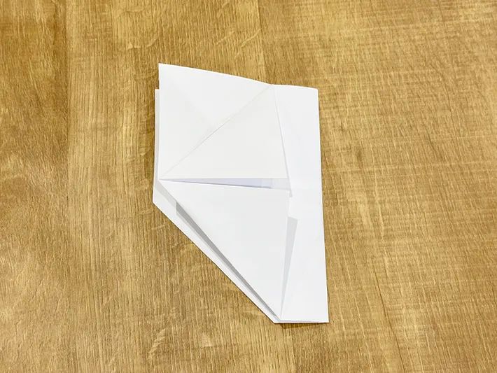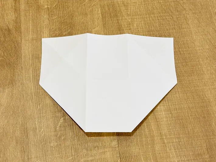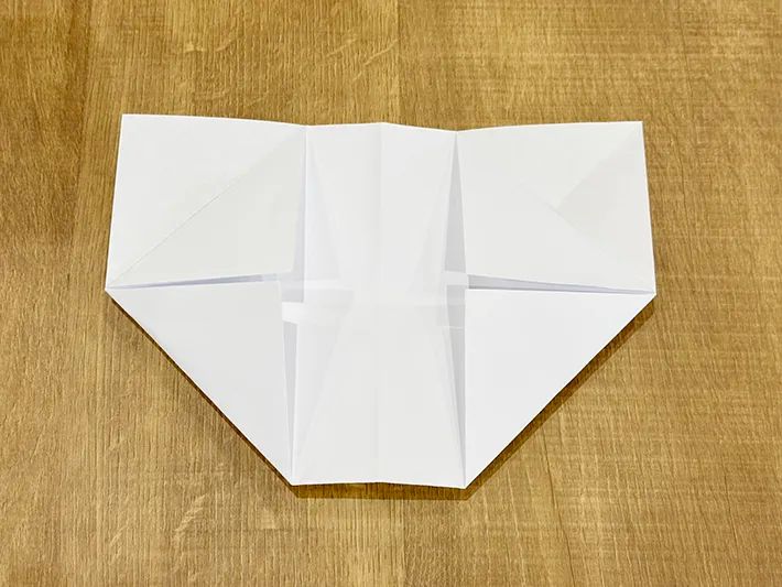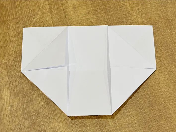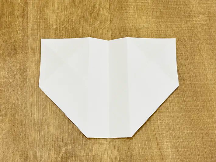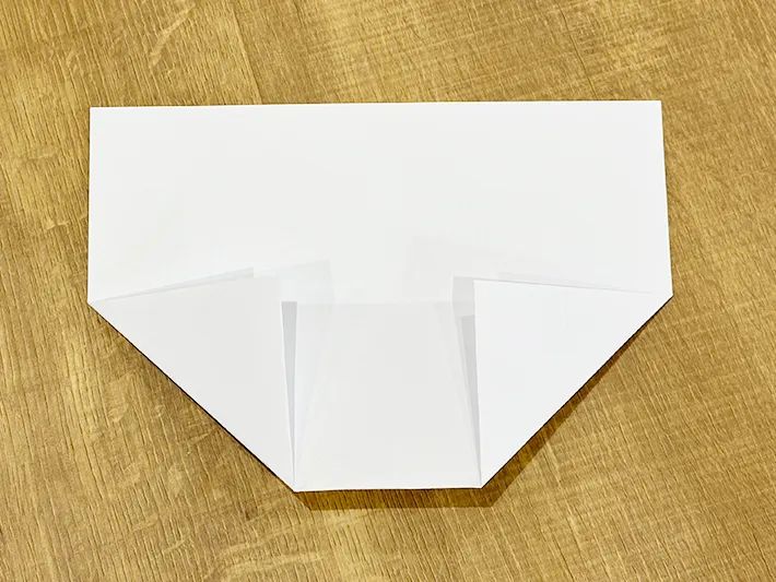 半分のサイズに開き、左下と右下の角を中央の横線に向かって三角に折ります。