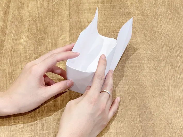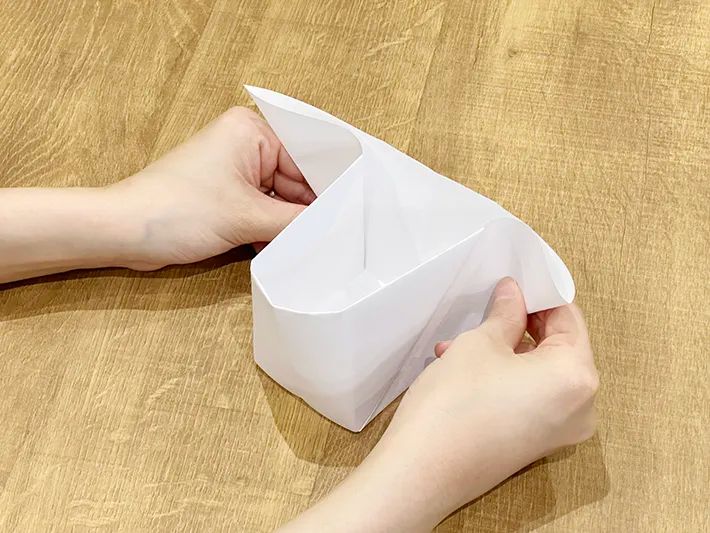 上部に手を入れ、手前に起こすように立体にします。