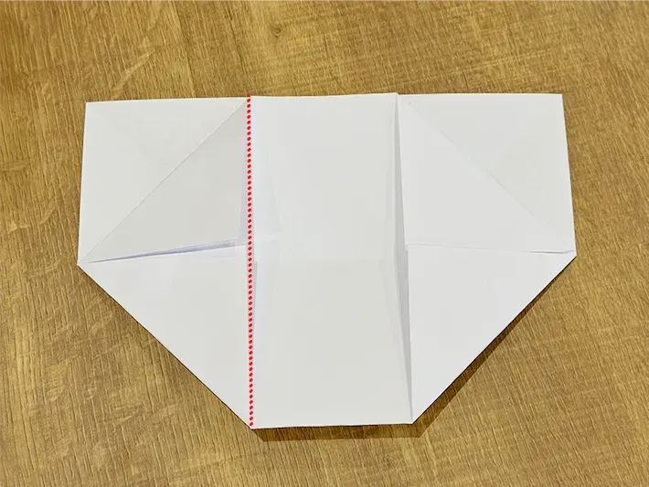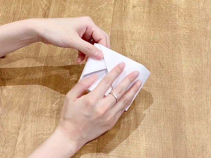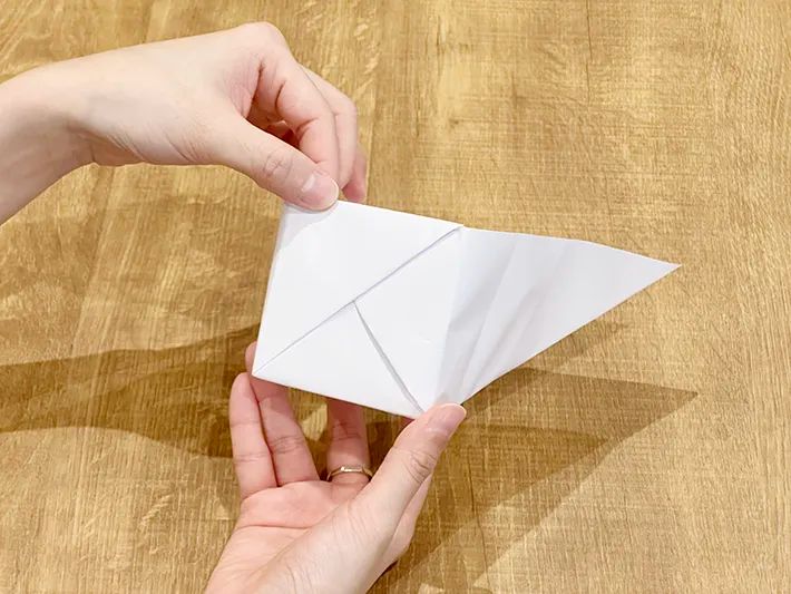 5.左上、右上は表面をめくり、中央の横線に向かって三角に折る