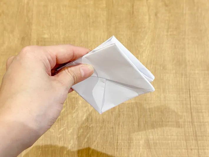 『4』と『5』の手順で4つの三角が折れたら、三角の側面に合わせて折り、すぐに開きます。