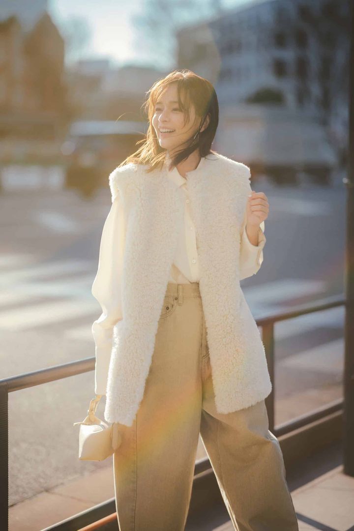 もこもこ素材の白ジレはベージュパンツと合わせてやわらかくまとめるのが正解。淡色のワントーンで統一すれば、甘さを抑えつつ品よく着地します。ナチュラルなのに洒落見えするバランスに。