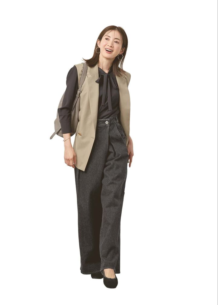 黒デニムを合わせて通勤スタイルをさりげなく刷新。ボウタイブラウスのきちんと感はそのままに、ベージュジレで柔らかさをプラス。かしこまりすぎない今どきバランスに整います。