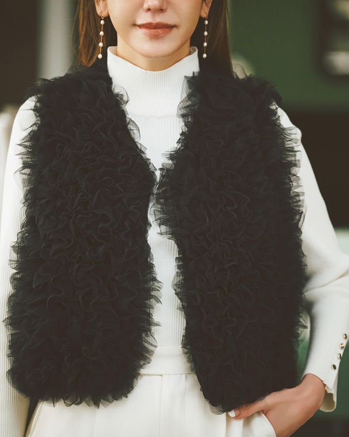 白のワントーンにチュールジレを重ねて、奥行きのある着こなしに。縦ラインがすっきり見えを後押ししつつ、軽やかな華やぎを叶えてくれます。