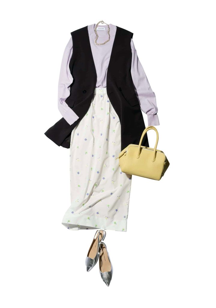華やかな柄スカートも黒のロングジレを重ねてぐっと引き締まった印象に。異なるテイストを自然につなぎ、コーデに統一感をプラス。春らしさを大人っぽく楽しめます。