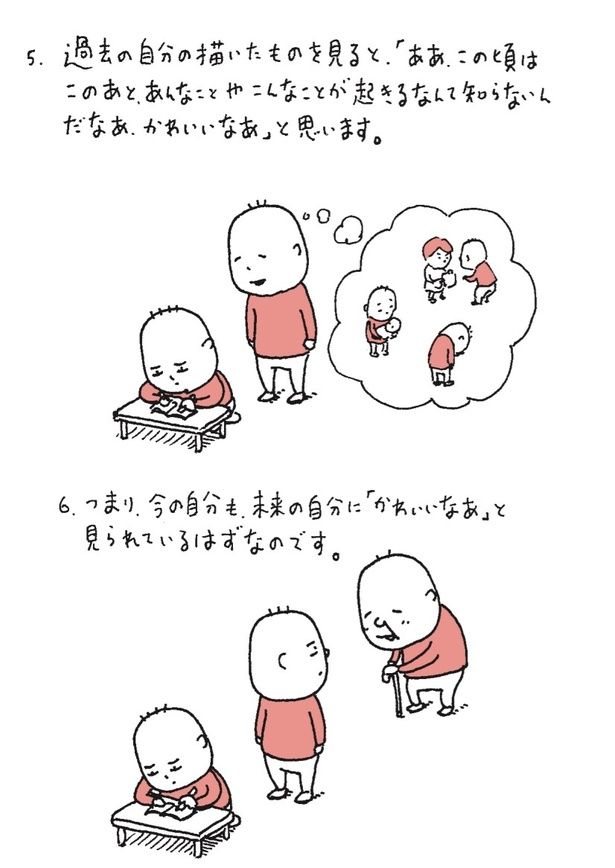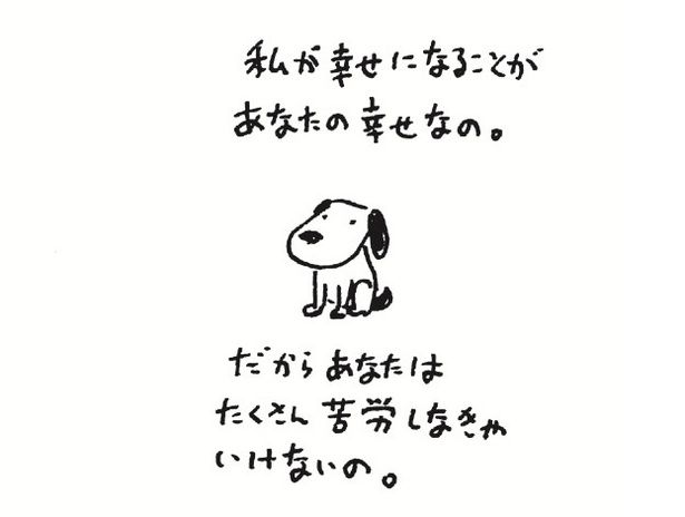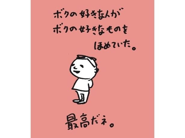 〈私が幸せになることがあなたの幸せなの。だからあなたはたくさん苦労しなきゃいけないの〉という言葉に添えられた犬(『そのうちプラン』)には、逆説的に「だから私はこんなに苦労ばっかりなのか!」としみじみしてしまうし、「ボクの好きな人がボクが好きなものをほめていた。最高だネ」という男(の子)にはきゅんとしつつ初心をとりもどすような気持ちになる。