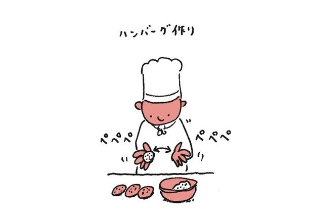でもただ渋い顔をしているオジサンや、「就活オンアイス」というダジャレだかなんだかわからない言葉、ハンバーグを作るだけのコック。意味なんてたぶんなんにもない瞬間をとじこめた、その愛らしさにこそ目を向けられる自分でいたいな、とも思う。ふふっと笑う。これ知ってる、と思い出す。あれに似てる、と連想する。ヨシタケさんのように描きためてはいなくても、心のなかに生きてきた日々のぶんだけ積もっているはずのスケッチをとりだしながら、つかのま、なんの役にも立たない時間をいつくしむ。明日から、いや、本を閉じた次の瞬間から、自分もこういう瞬間をスケッチしたいと思いながら町を歩く。そんな、なんでもなさの大事さを、この2冊はとりもどさせてくれる。