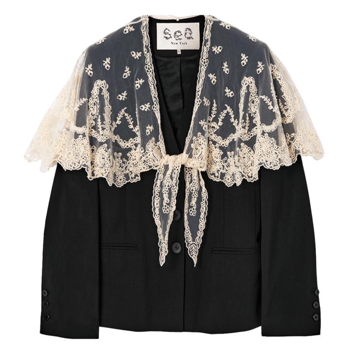 レースのケープを纏ったかのような、クラシカルで心ときめくデザイン。レース付きジャケット¥128,700(シーニューヨーク/S&T)