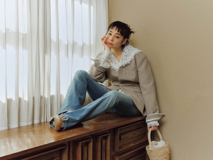レースブラウス¥25,300、ジャケット¥42,900(共にプランクプロジェクト/プランクプロジェクト 青山店)、デニムパンツ¥39,600(ディーゼル/ディーゼル ジャパン)、シューズ¥16,500(ヘブンリージェリー/サードマガジン)、バッグ¥86,900(ラスランバジンスキー/アマン)