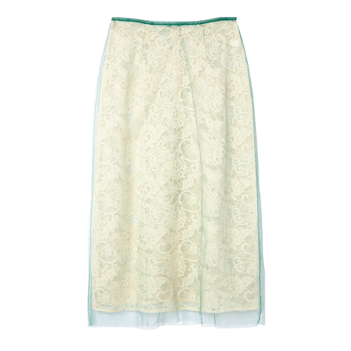 レースとチュールがレイヤードされたミドル丈スカート。デニムと合わせるのもオススメ。スカート¥39,600(マージ/S&T)