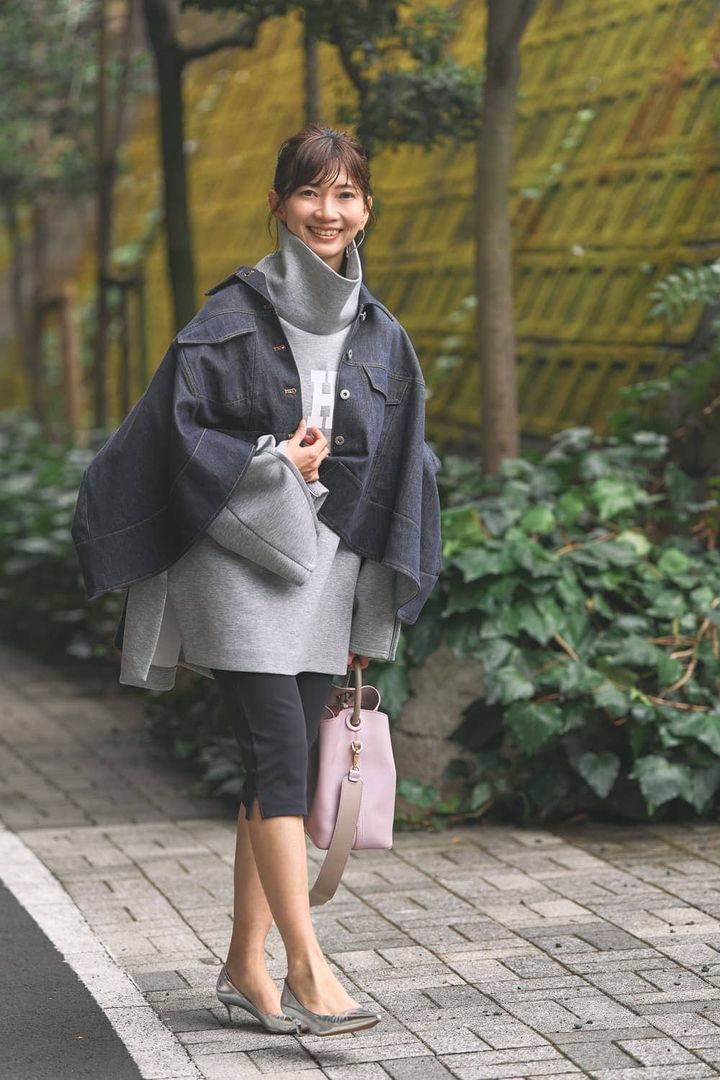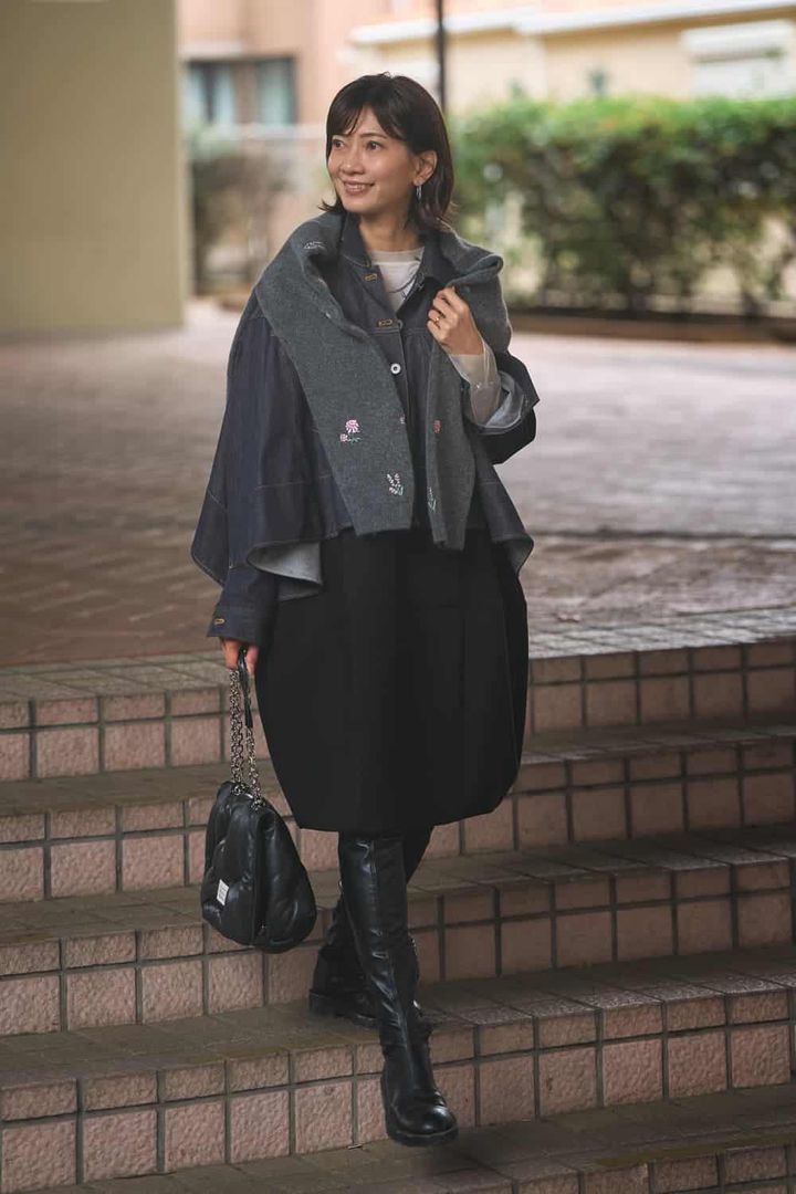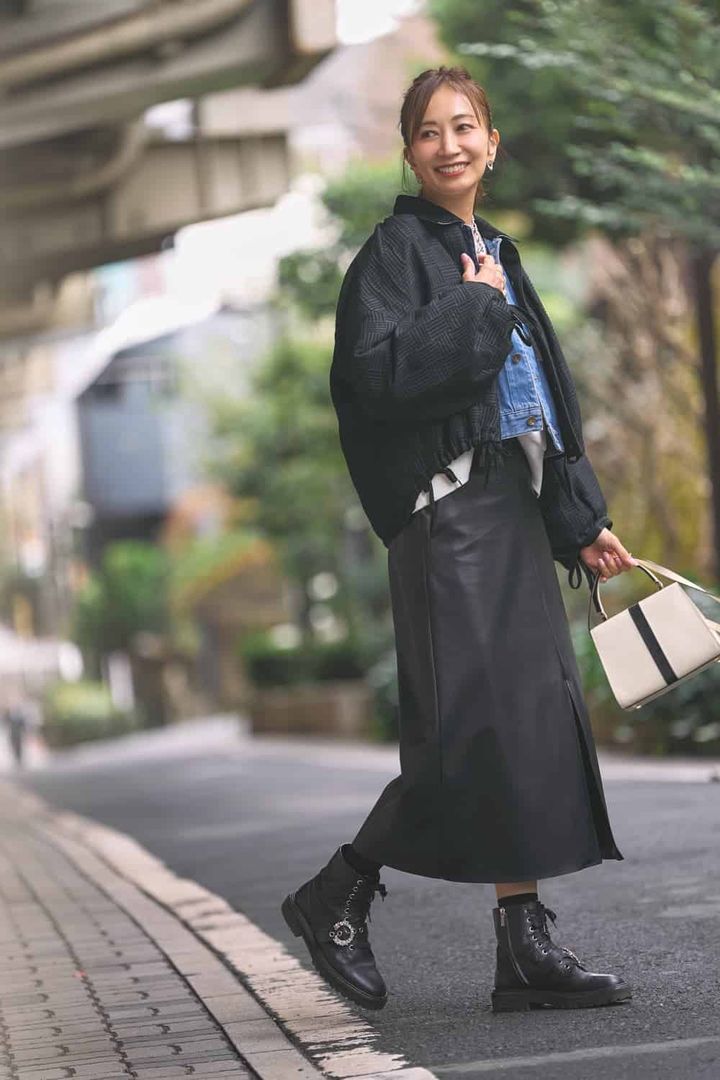 少し肌寒い日には、アウターのレイヤード技で暖かさとオシャレを両得! 今季ぜひ取り入れたいデニムジャケットを中に着こみました。上半身のボリュームに負けないように、ボトムにはヴィーガンレザーとショートブーツでバランスをとりました。コントラストが効いたバッグがポイント!
