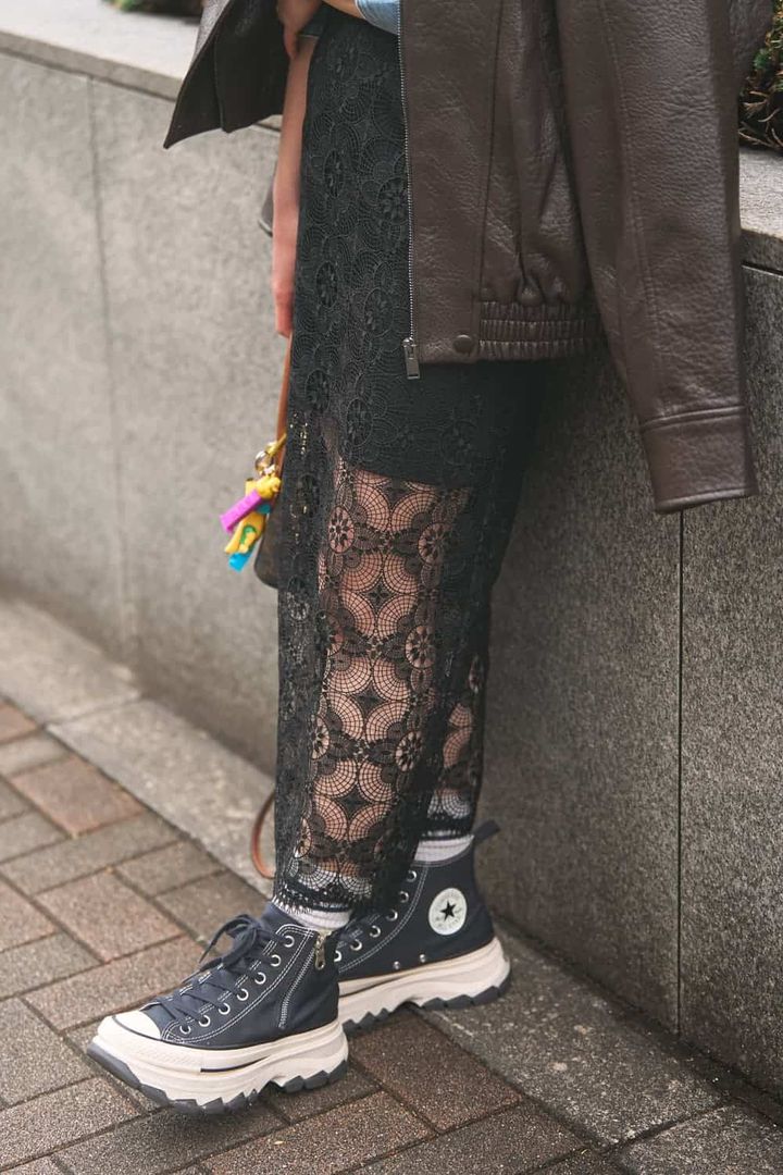 突然の雨や水ハネでも汚れが目立たないブラックパンツはこの時期に頼りになります。足首周りの一癖デザインで洒落見えする1本。黒パンツにロンT合わせのシンプルコーデも、フード付きのジャケットを合わせれば程よくカジュアルダウン。エナメルのシューズなら汚れも拭き取れるから安心です。