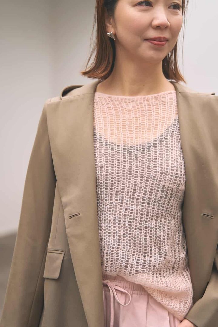 春になるとやっぱり着たくなるのがピンク! 上下ピンクでもカーキベージュのジャケットを合わせれば大人仕様に。淡いベージュピンクなので肌馴染みもよく、ジャケットを羽織ればきちんと感もキープできます。シアーニットはこの時期にちょうどいい暖かさ。抜け感の演出にも一役買います。