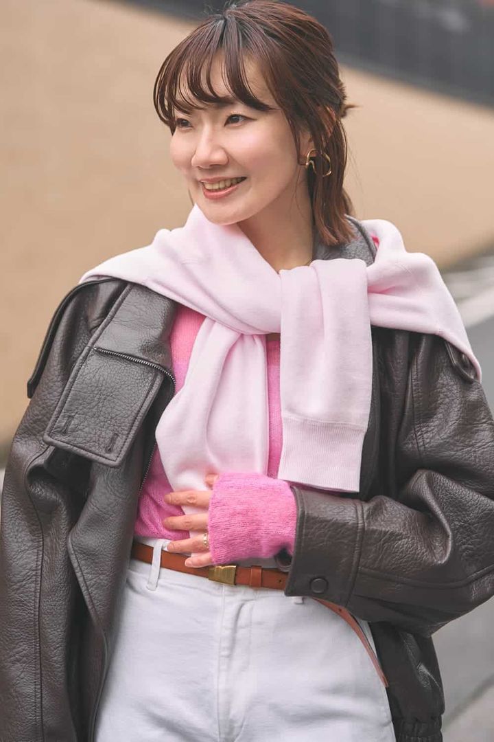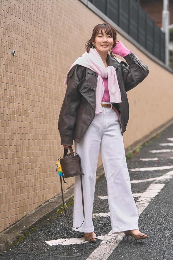 お花見に行きたくなる春らしいトレンドカラーのピンク×ホワイトコーデは、そのままだと私には甘すぎるので、辛口レザージャケットを合わせて糖度を調節しました。シアーニットとスウェットでピンクの濃淡を重ねて簡単オシャレ見えを狙いました。レイヤードコーデは着脱することで体温調節がしやすいのも助かります。