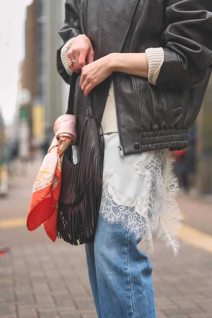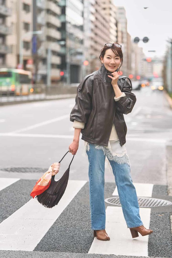肌寒い日には上のボタンだけ留めて海外スナップ風に着こなすのが好きです。レザーが柔らかくオーバーサイズなので中に着るものを選びません。暖かいニットを着こめばかなり早い時期から楽しめる1着。レースや明るい色のデニム、フリンジバッグを合わせて春っぽさも意識しました。