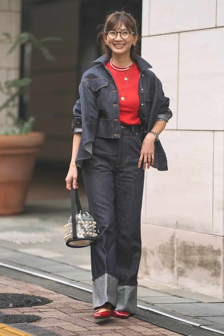 デニムのセットアップは色味や形違いでたくさん持っています! こちらのシーニュのセットアップはキレイめな雰囲気で、裾折り返しデニムが今っぽく、コーデをあれこれ考えずにコレだけでキマるのが嬉しい。インナーとパンプスは赤で色味を統一し、クリアなバッグを選んで季節感も演出しました。