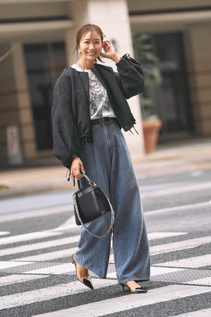 春になったらデニムにフォトTシャツをインしてカジュアルスタイルを楽しみたい。バッグや小物は黒で揃えて上質なブルゾンを羽織れば、デニムコーデもほんのりエレガントな大人仕様に仕上がります。キャッチーなハートモチーフのクリアパンプスで抜け感も添えました。