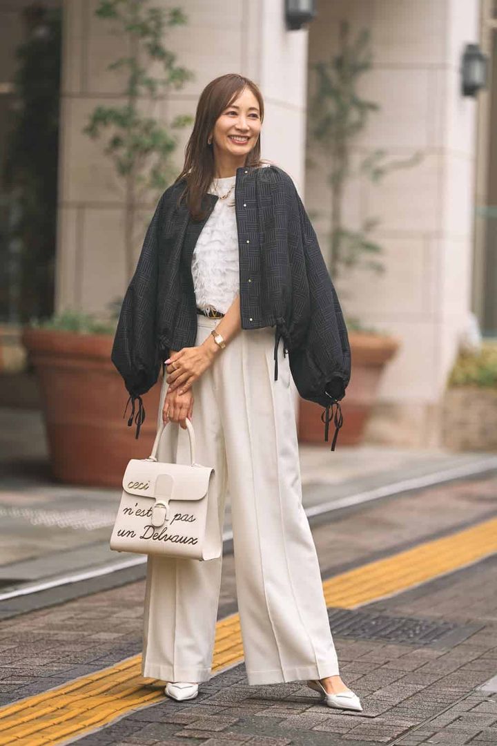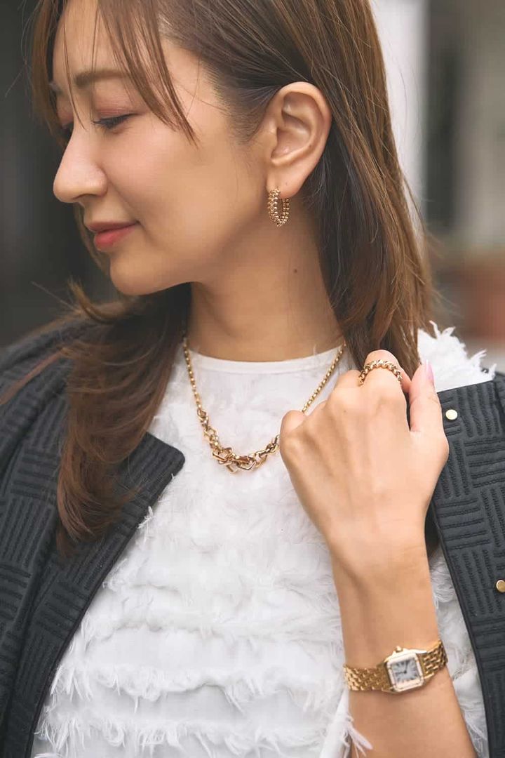 梅雨の気配が感じられる頃には、ホワイト多めのクリーンなモノトーンコーデで見た目も気持ちも明るく! フリンジディテールのトップスとサラッとしたワイドパンツ、異なる素材感で奥行きを出しました。バッグはあえて大きめサイズを選び纏まりすぎないように。白コーデにはジュエリーをゴールドに統一する合わせが気分。