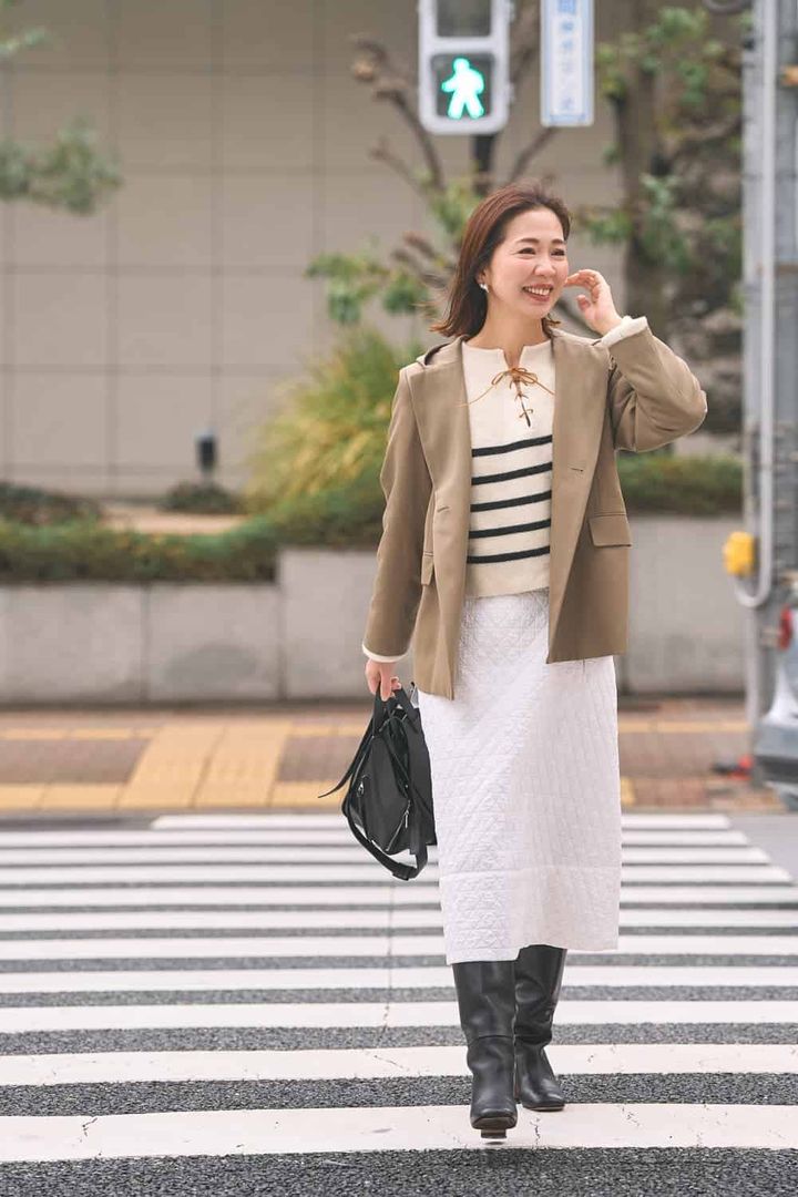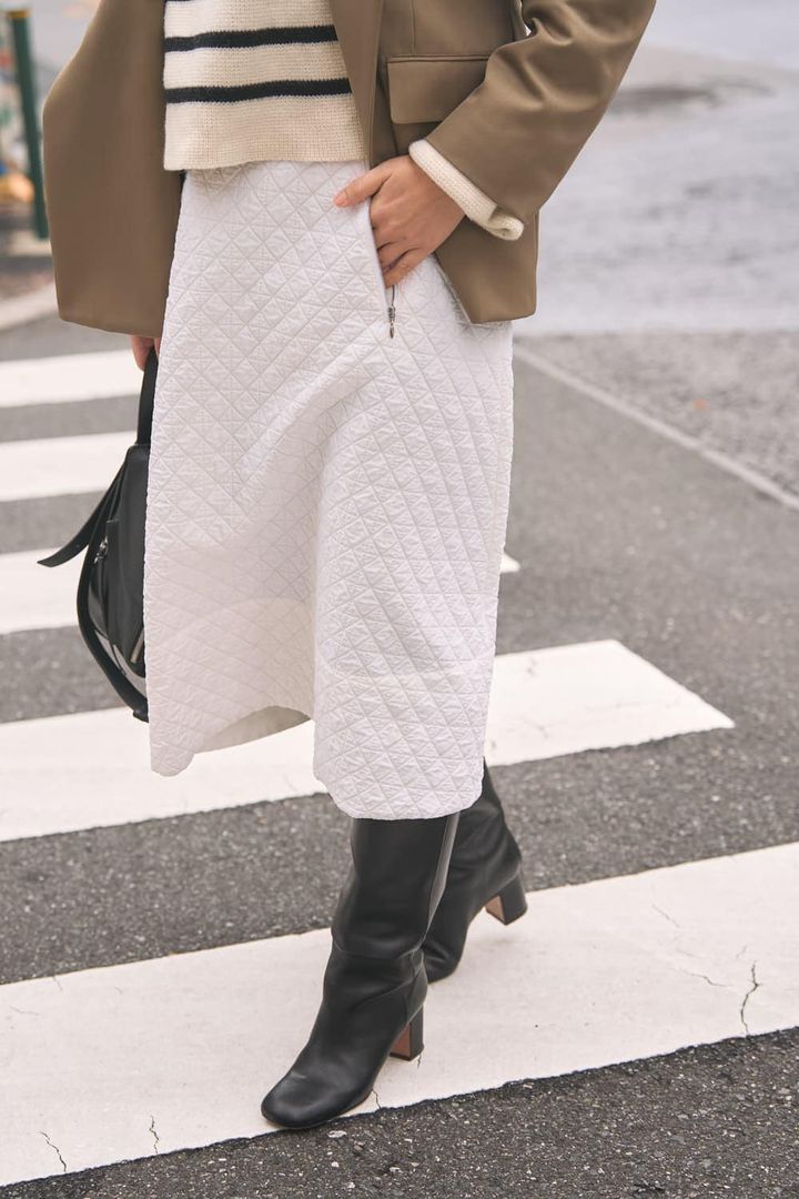 厚手のセーターとキルティングのスカートを合わせれば、少し肌寒い日にもアウターはこれ1枚で大丈夫! 暖かい素材ですが、色合いはホワイトを多めにまとめて春らしい爽やかさも意識しました。防寒力を担うブーツとバッグは黒で纏めて、ホワイトコーデを引き締めました。