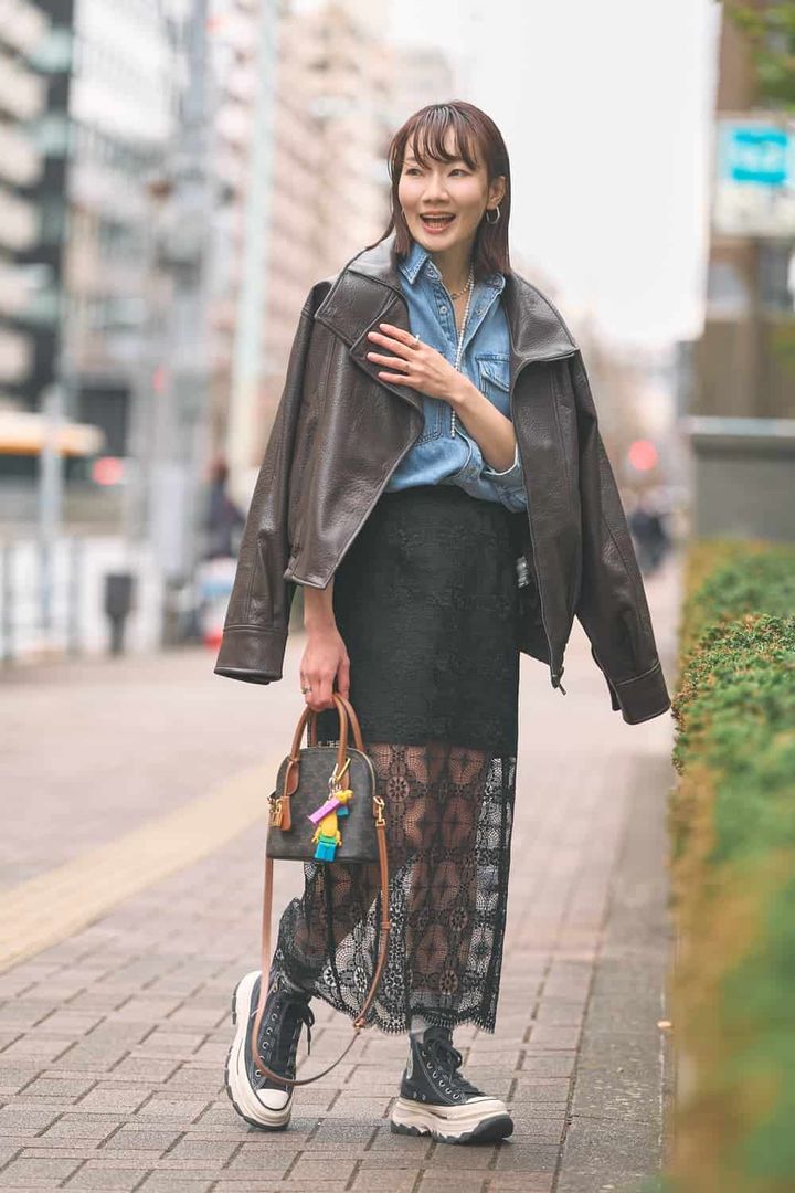 まだ朝晩は肌寒さを感じる日もあるので、レザージャケットを肩掛けして出掛けると安心です。日中はだいぶ暖かいのでインナーは軽やかに、デニムシャツと透け感のあるスカートを合わせました。カジュアル味が強い時はかっちりしたバッグやパールの重ね付けでコーデを引き締めます。バッグのチャームで遊び心を。